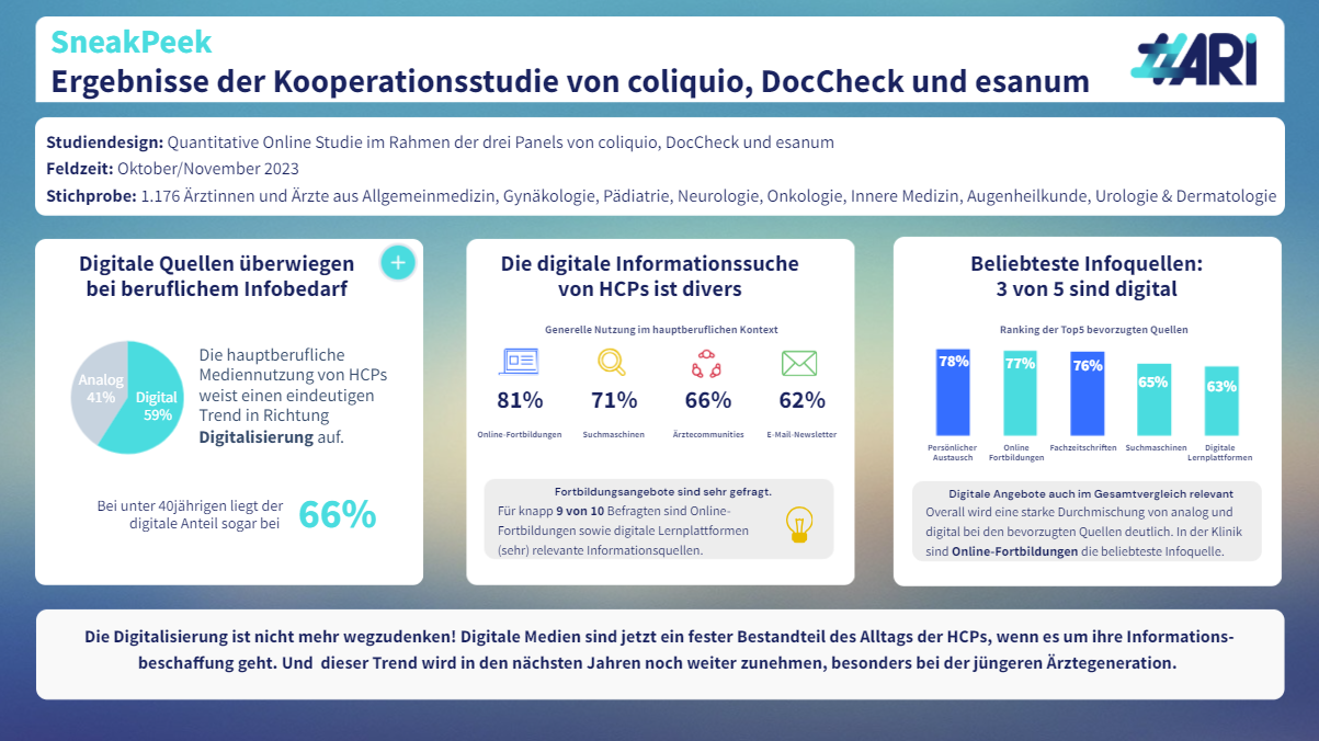 Für die ARI-Studie wurden über 1.000 Ärzte verschiedener Fachrichtungen aus dem deutschsprachigen Raum auf den Ärztenetzwerken coliquio, DocCheck und esanum zu ihrer analogen sowie digitalen hauptberuflichen Mediennutzung befragt und liefern so ganzheitliche Erkenntnisse zum Nutzungsverhalten: Insgesamt setzen Ärzte im hauptberuflichen Kontext verstärkt auf Online-Medien, sodass digitale Quellen im Schnitt 59 Prozent ihrer Mediennutzung ausmachen. Bei jüngeren Ärzten (unter 40 Jahren) steigt der Anteil digitaler Medien auf 66 Prozent.